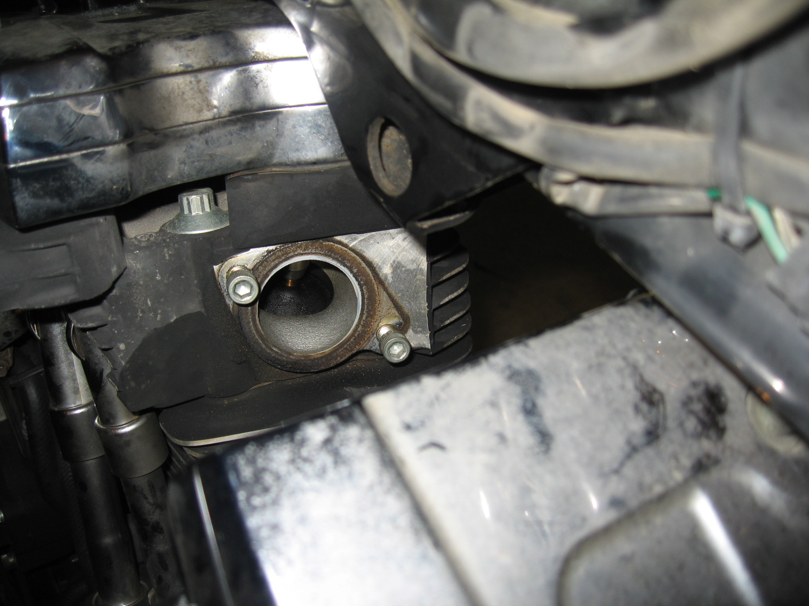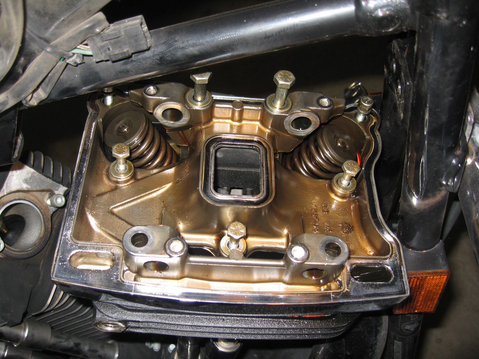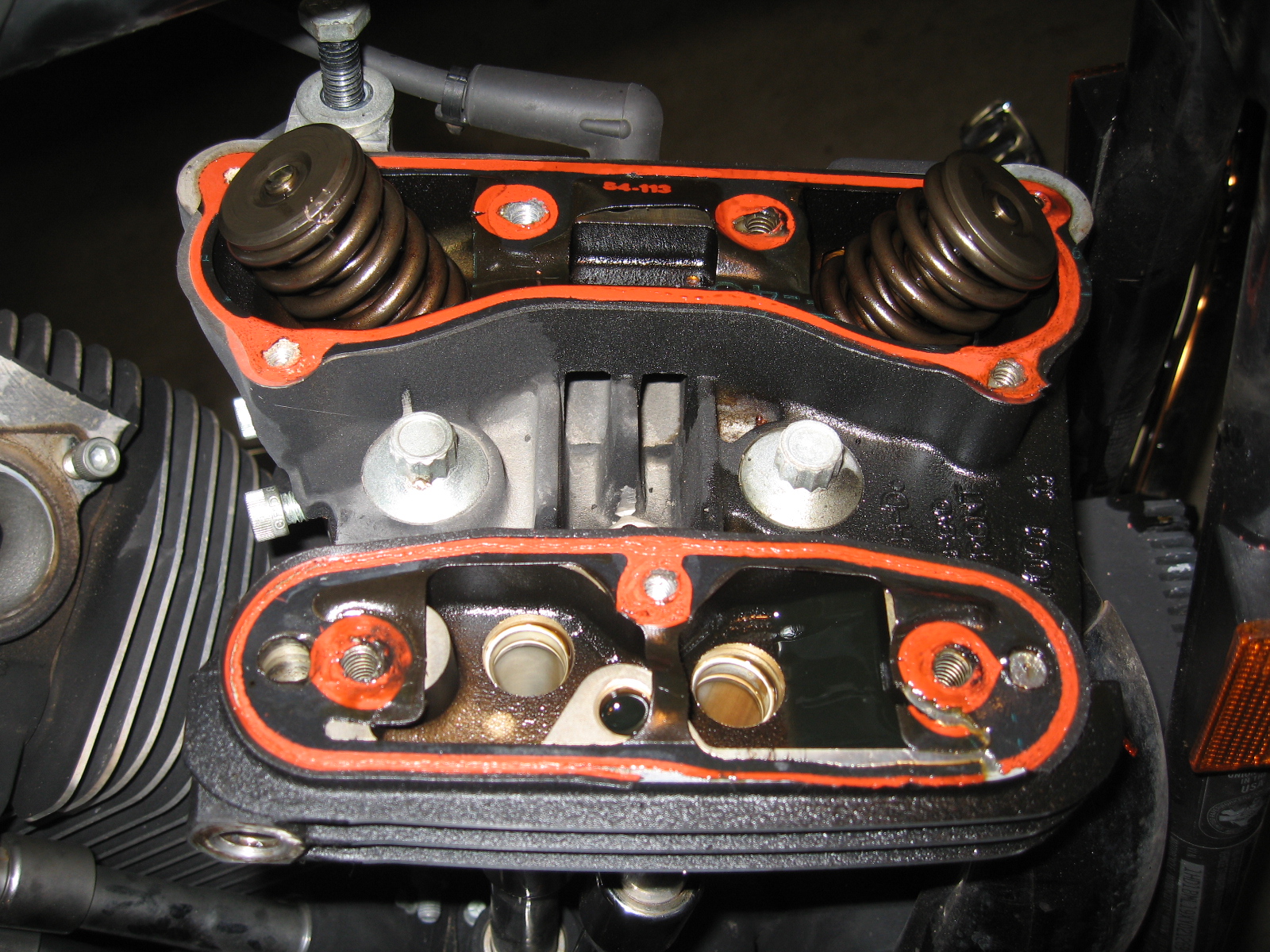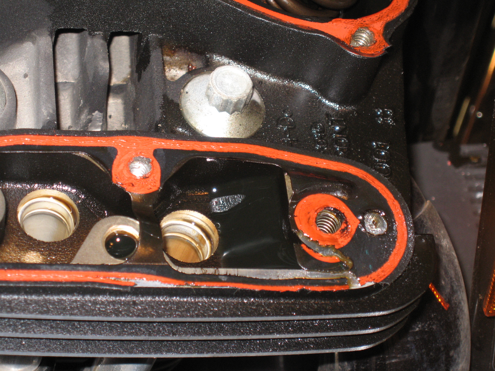 Repair engine oil leak on front cylinder between rocker box and cylinder head. The factory seal failed during a dyno run at Harley Haven back in 1999. The repair lasted until now (2009) but left the edge of the gasket protruding from the seam. Recently that protruding edge broke and the leak began.